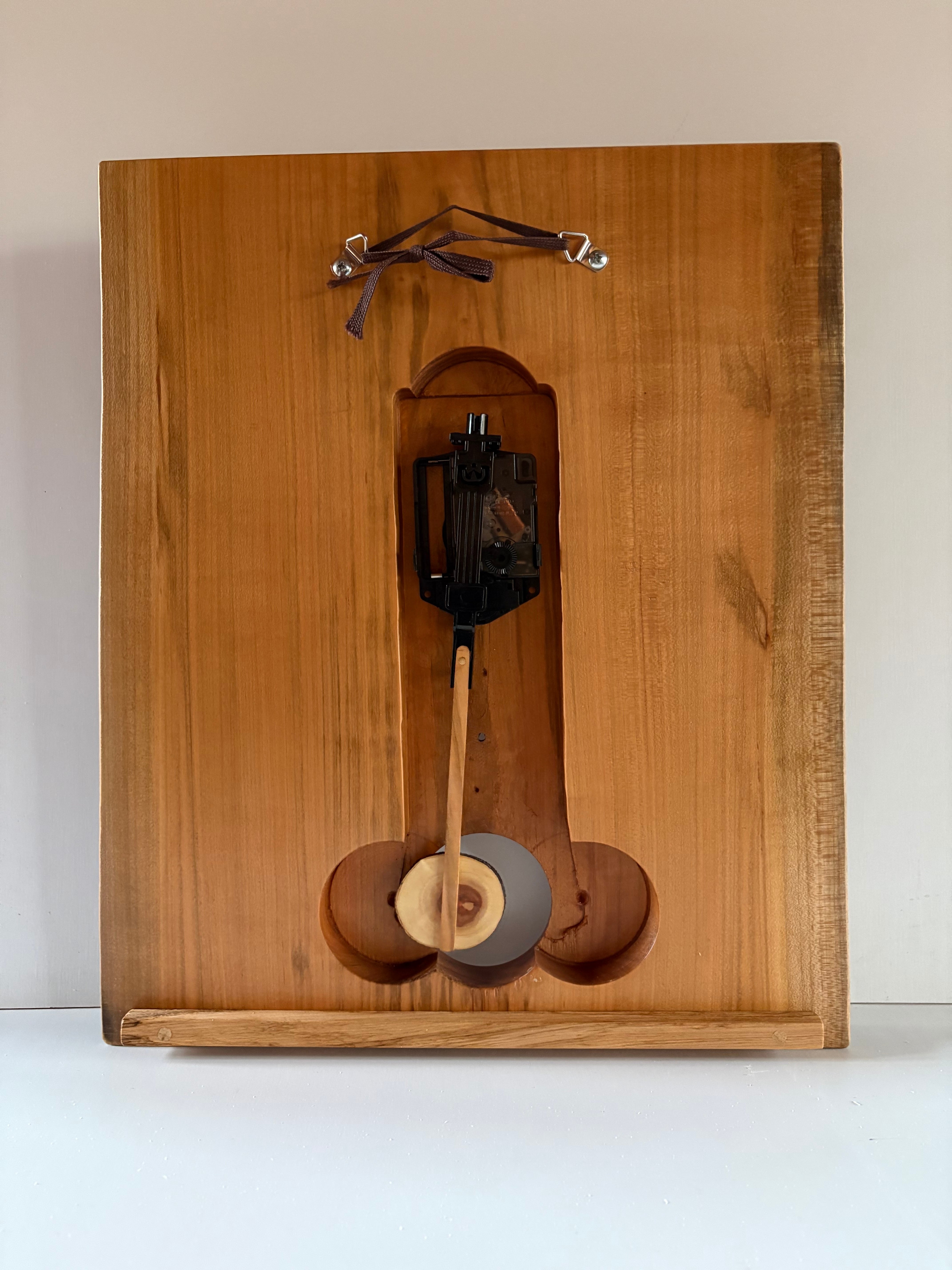 振り子のデザインは、小枝を輪切りにした年輪が見える切り株のようで、温かみがある印象を与えます。また、長針や短針には丈夫なウエンジを使用し、職人の手によって薄さ1~2ミリに仕上げられています。木が持つ自然な質感を大切にした素晴らしい仕上がりです。